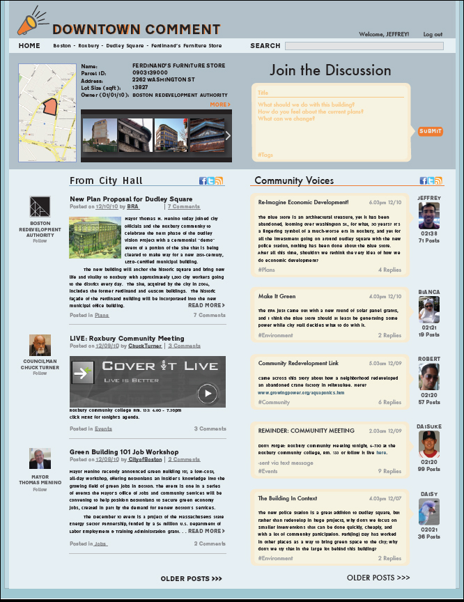To the right of the city’s section is the community voice, a parallel blog of public commentary. Currently, when you go to a public meeting (assuming you know when it is, what it is about, and can make it) and you take a stand on an issue and explain your point, where does it go? In Boston, you can write and call and email City Hall, you can attend your meetings, but where is the record, where is the paper-trail? And if I wanted to know what people felt about a project six months ago, how would that happen? Downtown Comment’s community voice column is designed to solve these problems; by cataloging discussion, it takes a snapshot of opinion, both for immediate action and long-term understanding.